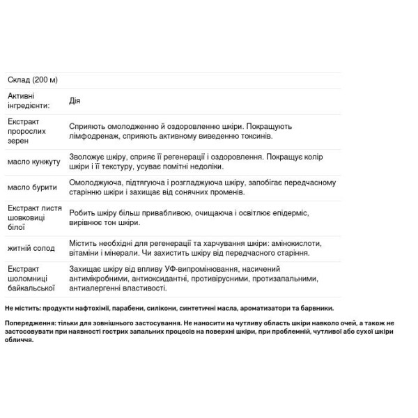 - Екстракт пророслих зерен - сприяє омолодженню шкіри, покращує лімфодренаж та активне виведення токсинів.