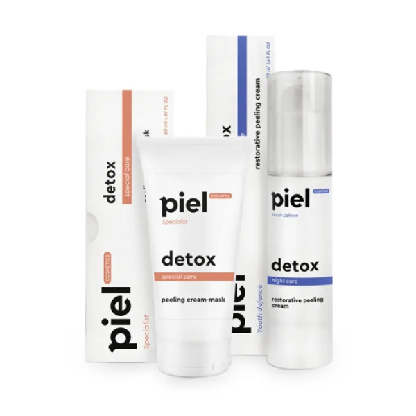 Набір "Детокс" від Piel Cosmetics включає крем-маску і нічний крем з ефектом пілінгу, які ідеально доповнюють один одного для комплексного догляду за втомленою шкірою. Ці продукти розроблені для глибокого очищення та відновлення природного кольору обличчя, а також для підвищення тонусу шкіри. Крем-маска Detox Peeling Mask допомагає покращити текстуру шкіри, усуваючи ознаки гіперкератозу та очищаючи пори від забруднень. Завдяки регулярному застосуванню ви помітите, як шкіра стає рівною, а пігментні плями менш помітними. Вона підходить для будь-якого типу шкіри, включаючи чутливу, забезпечуючи дбайливий догляд, зволоження та заспокоєння.