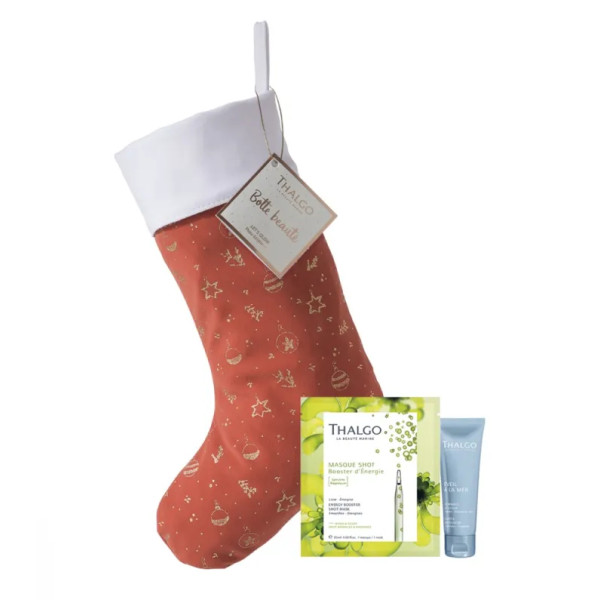 Набор включает нежный скраб для лица объемом 50 мл, активную тканевую маску объемом 20 мл и новогоднюю шкарпетку в качестве упаковки.